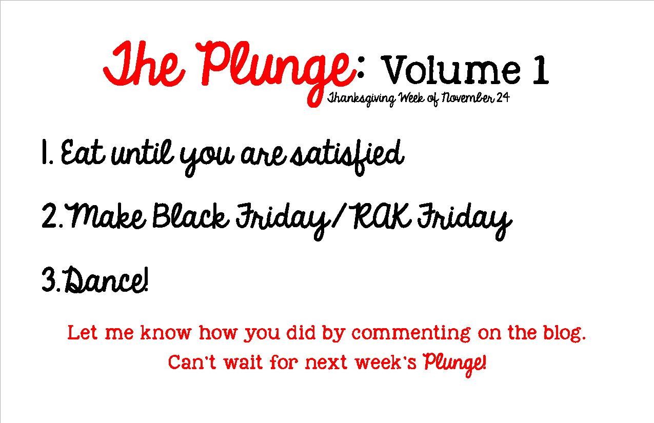 All of my experiences with Black Friday have involved being pushed, prodded, cut off, and well, let’s just say people don’t show their best sides when they have one singular goal: getting that gift on blue light special before anyone else does. So the second plunge for this week is to do a Random Act of Kindness on BLACK Friday. If you’re not a shopper, then you can still do an act of kindness. Need some ideas? Well, I’m SO GLAD YOU ASKED!
