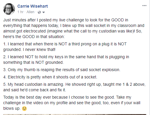This morning I reached out to my FeeBees (that’s Carrie-speak for my Facebook friends) and gave them that very challenge. I asked them, just for the next day, to find the good in every situation, no matter how challenging, no matter how difficult, no matter how devastating.