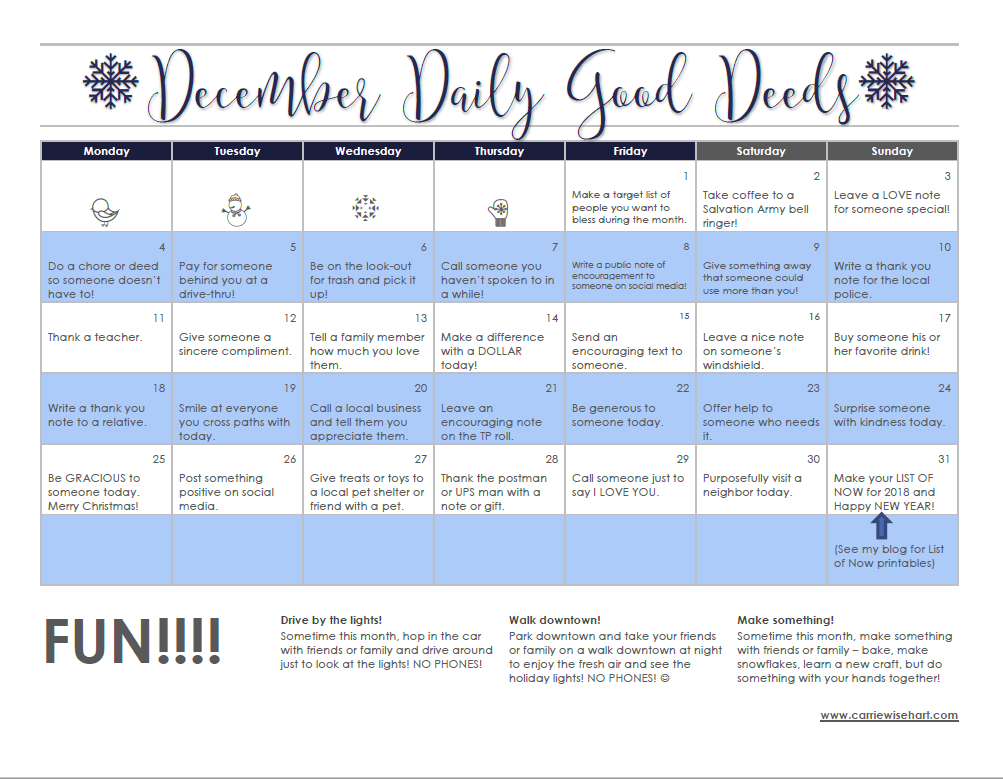 This year, instead of just creating a printable LIST, I created a printable calendar which you can print here: December Daily Good Deeds Calendar PDF PRINTABLE