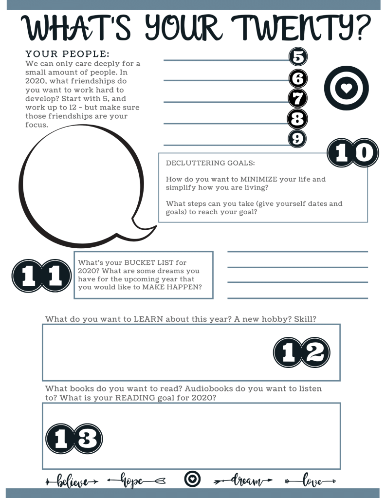 I’ve found the best way to complete my goals is to stop wishing and start doing, and in order to DO, I have to actually think about the goals and write them down. So this year, I created a three page PRINTABLE that you can write down your TWENTY goals for 2020.